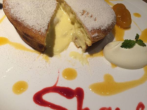 爆漿的視覺太享受了,鬆餅搭上麻糬,再加上馬斯卡澎起司的口感